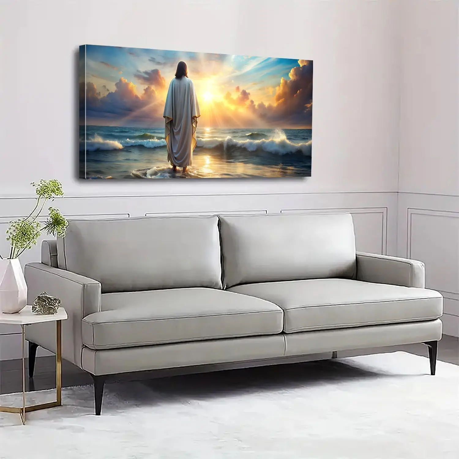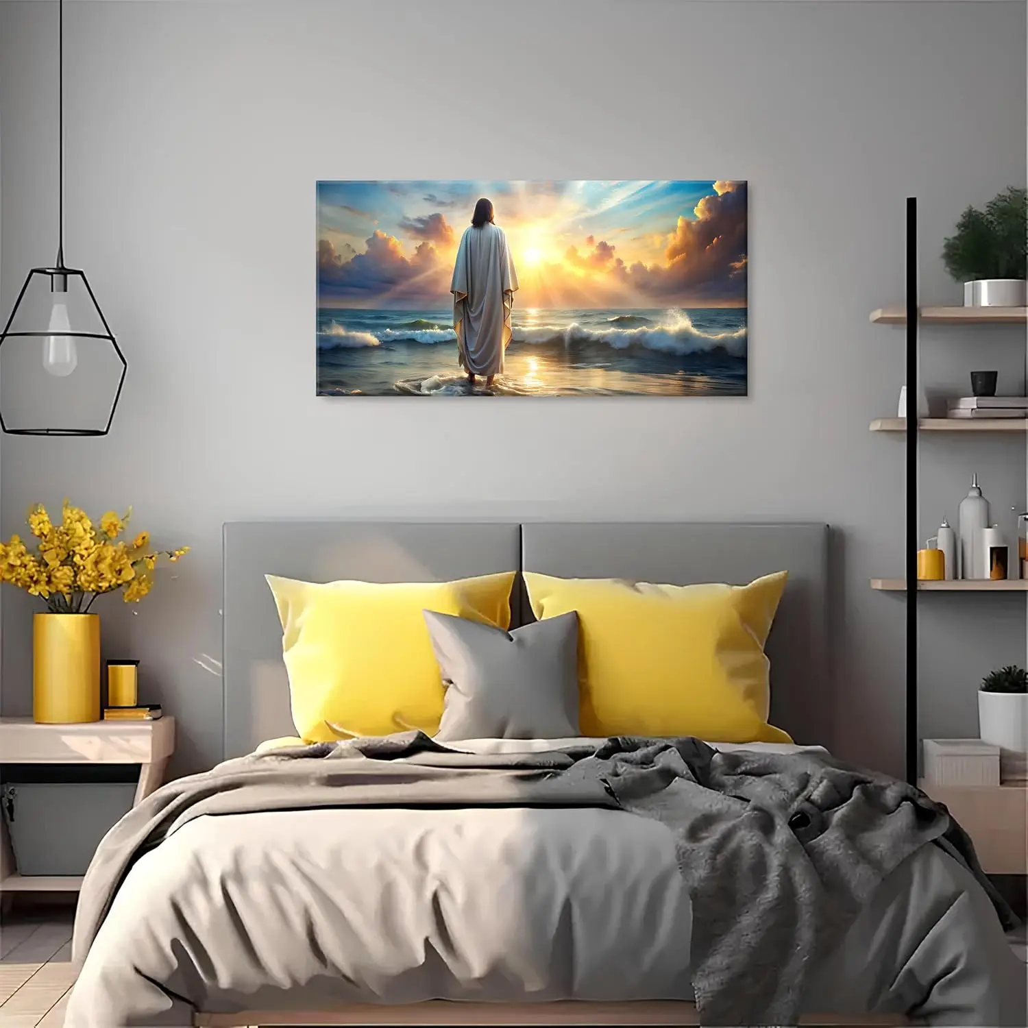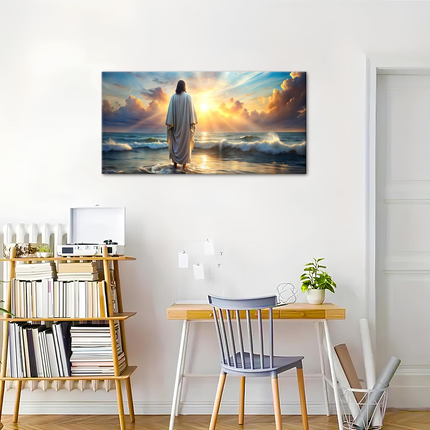 Custom Jesus Walking on Water Wall Art Sunset Ocean Christian Religious Painting Print on Demand No Tax Church Home Decor